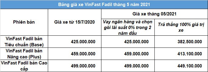 xin gửi chính sách của dòng xe Fadil vào thời điểm tháng 5/2021 qua bảng sau :