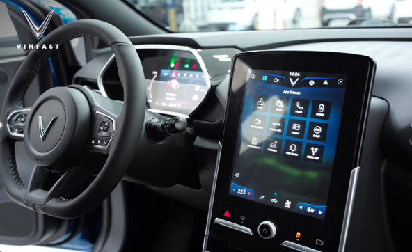 Về nội thất, VF e34 có vô lăng 3 chấu vát đáy thể thao kiểu D cắt chỉnh cơ 4 hướng, có kèm chức năng sưởi. Nằm sau là cụm đồng hồ dạng màn hình LCD kích thước 7 inch, màn hình thông tin giải trí đặt dọc, kích thước 10 inch kết nối Android Auto, wifi, Apple Carplay, Bluetooth.